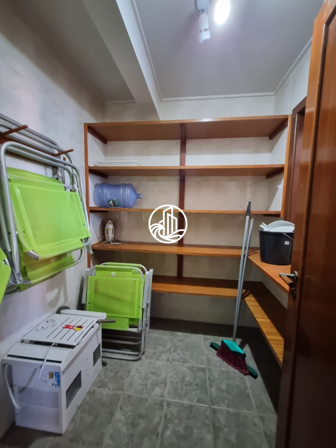 Área de serviço com máquina de lavar roupas e despensa