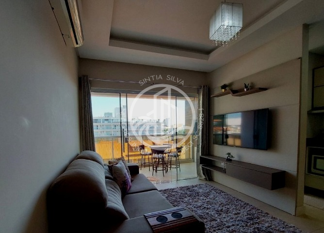 Sala de estar e jantar integradas com TV e ar-condicionado